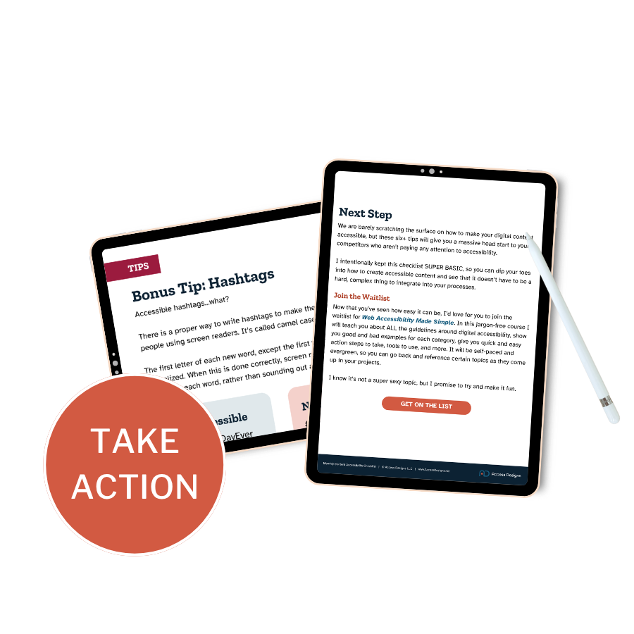 I invite you to join the Access Designs community. I aim to provide helpful resources and easy to implement steps to make your content and brand more inclusive.